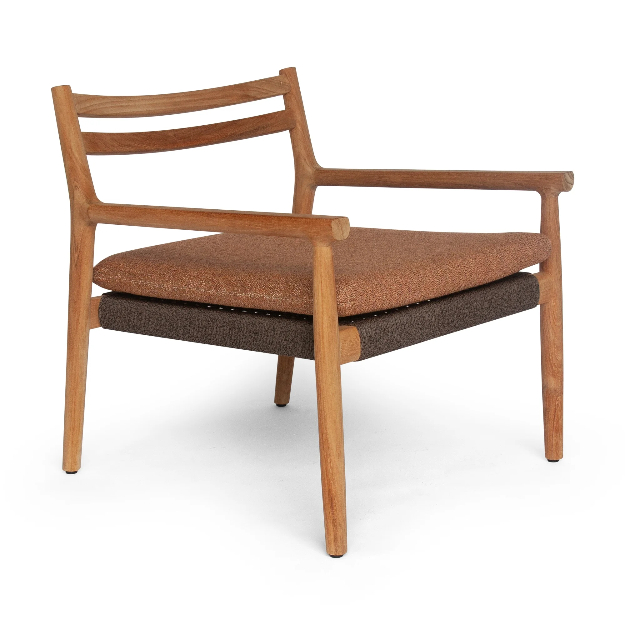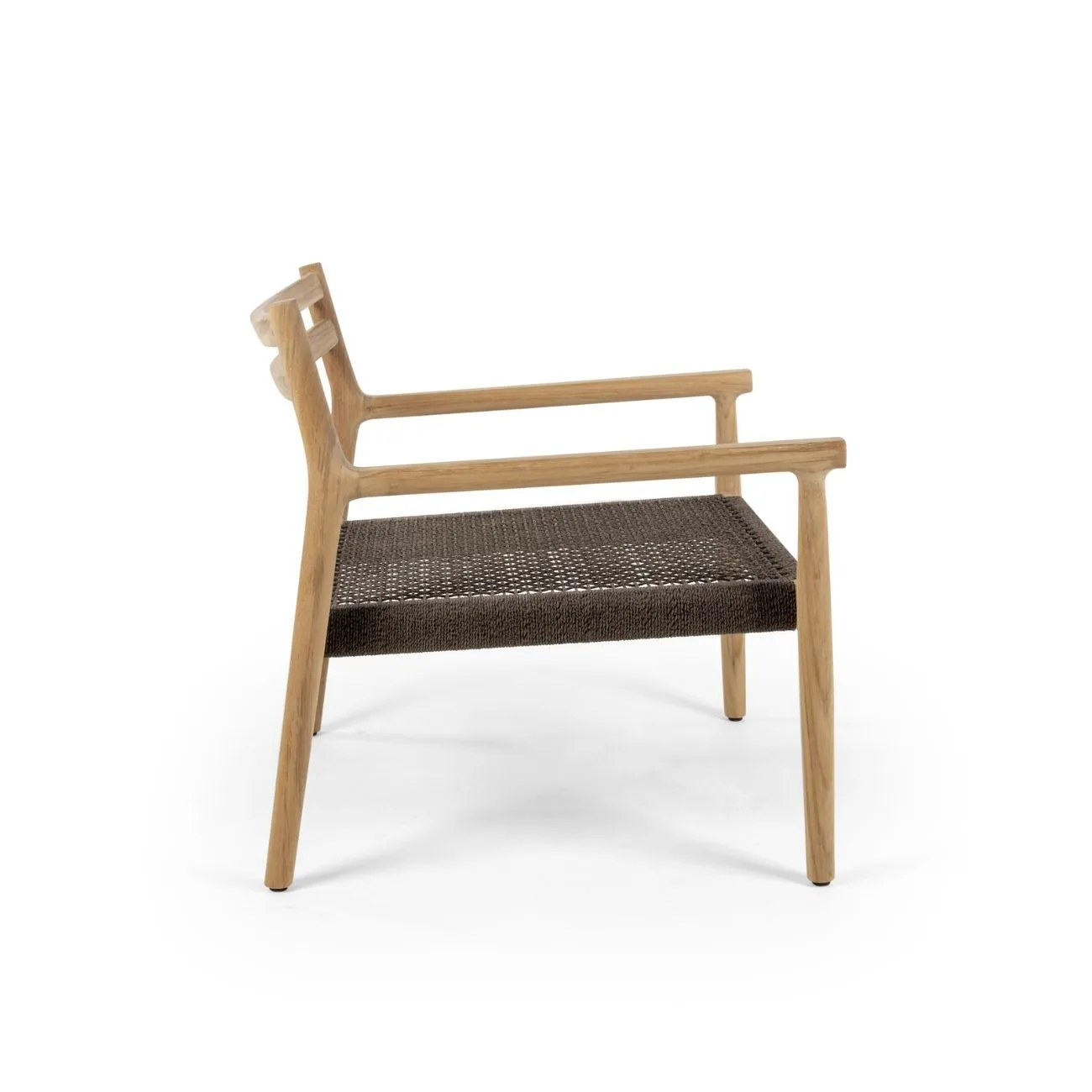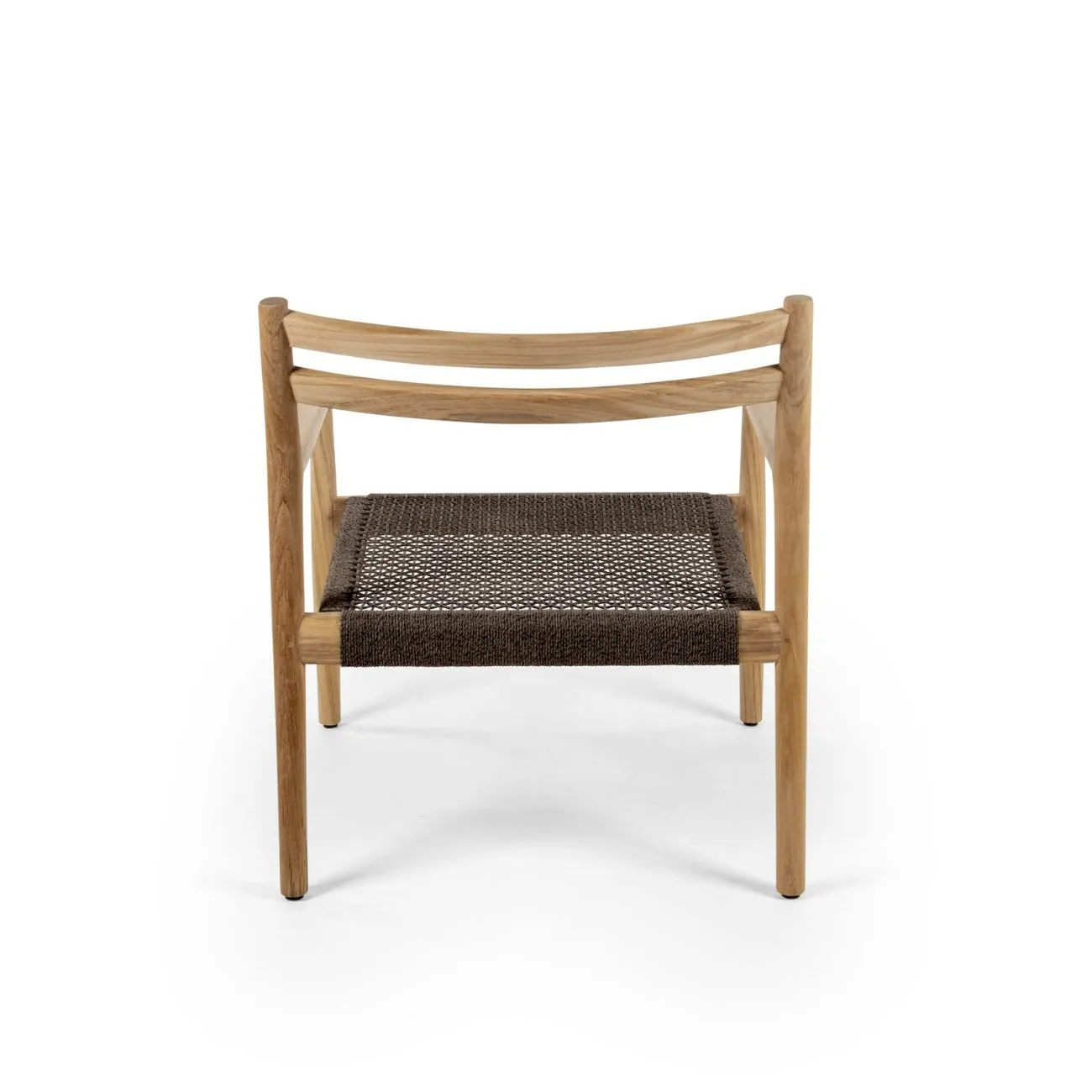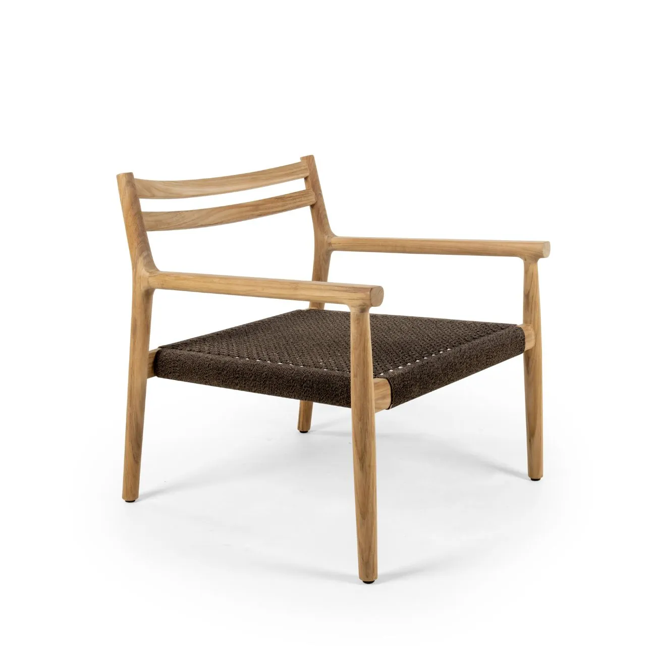 The Florence lounge chair combines a teak base with dark rope seating, offering both style and comfort. Its clean design and warm materials create a relaxed, summery vibe. Perfect for terraces, patios, or any outdoor lounging area.
