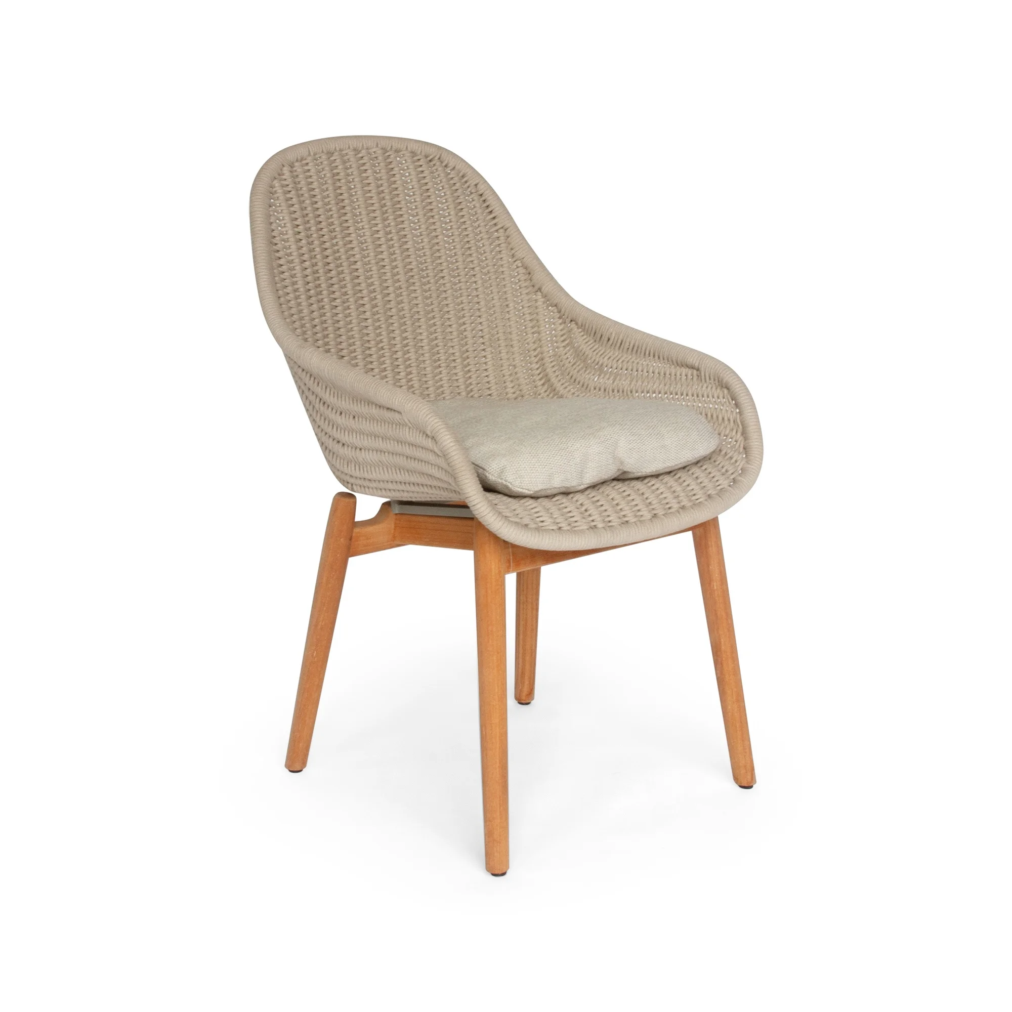 The Forli arm chair, designed by Mathias De Ferm, features a teak base with rope seating for a blend of comfort and style. Its minimalist design fits effortlessly into any outdoor space. Perfect for relaxing in solitude or with company.