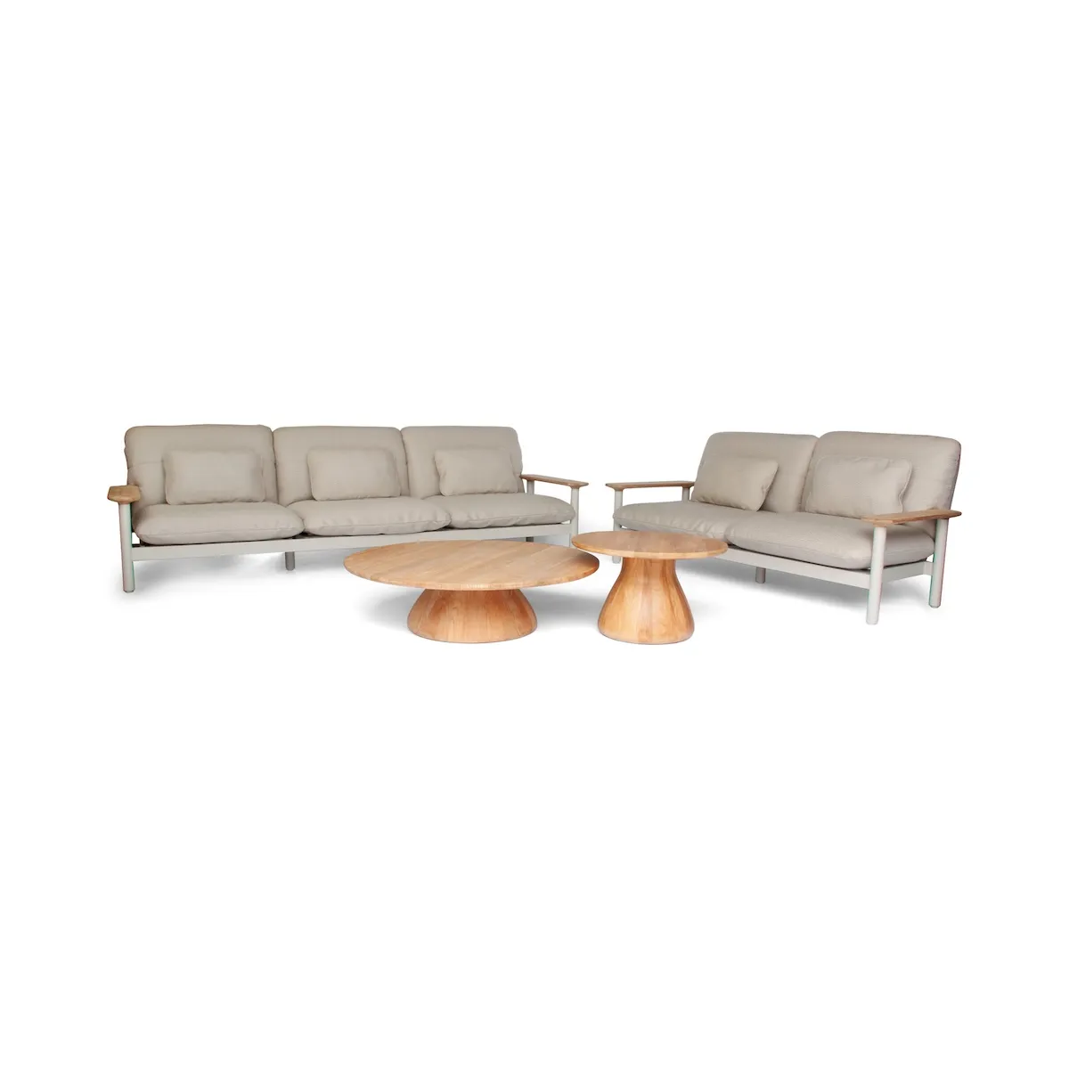 The Maddelena 3-seater lounge sofa is available in an aluminum base and teak armrests. Its spacious design and elegant finish provide both comfort and style, making it a perfect addition to any outdoor living area.