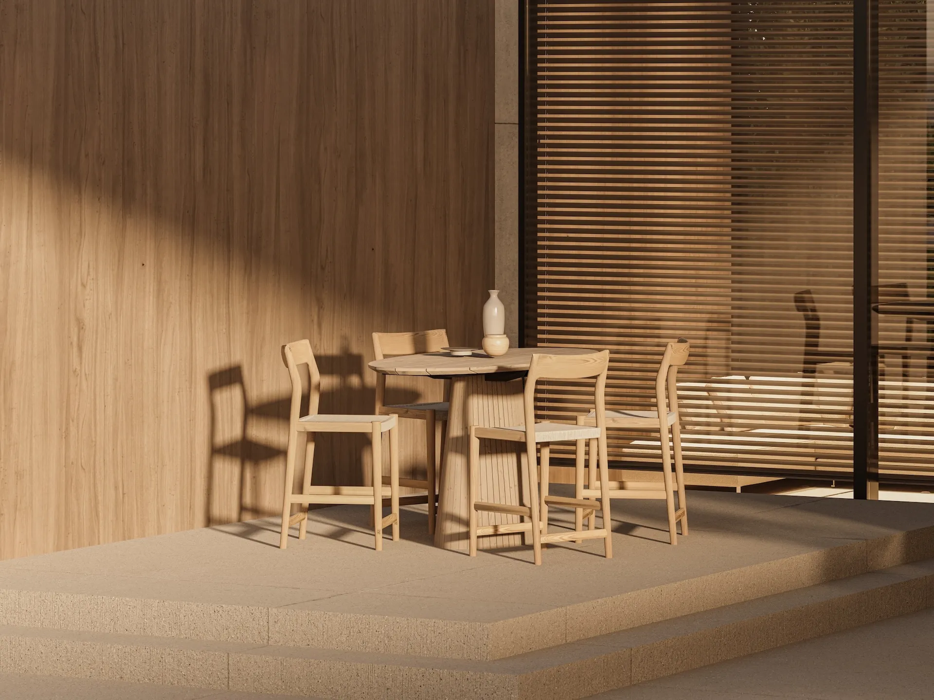 Levanto features fully teak tables in oval, round, and bar options. Designed for social gatherings, the collection showcases beautiful slatted bases and tops, delivering both elegance and functionality.