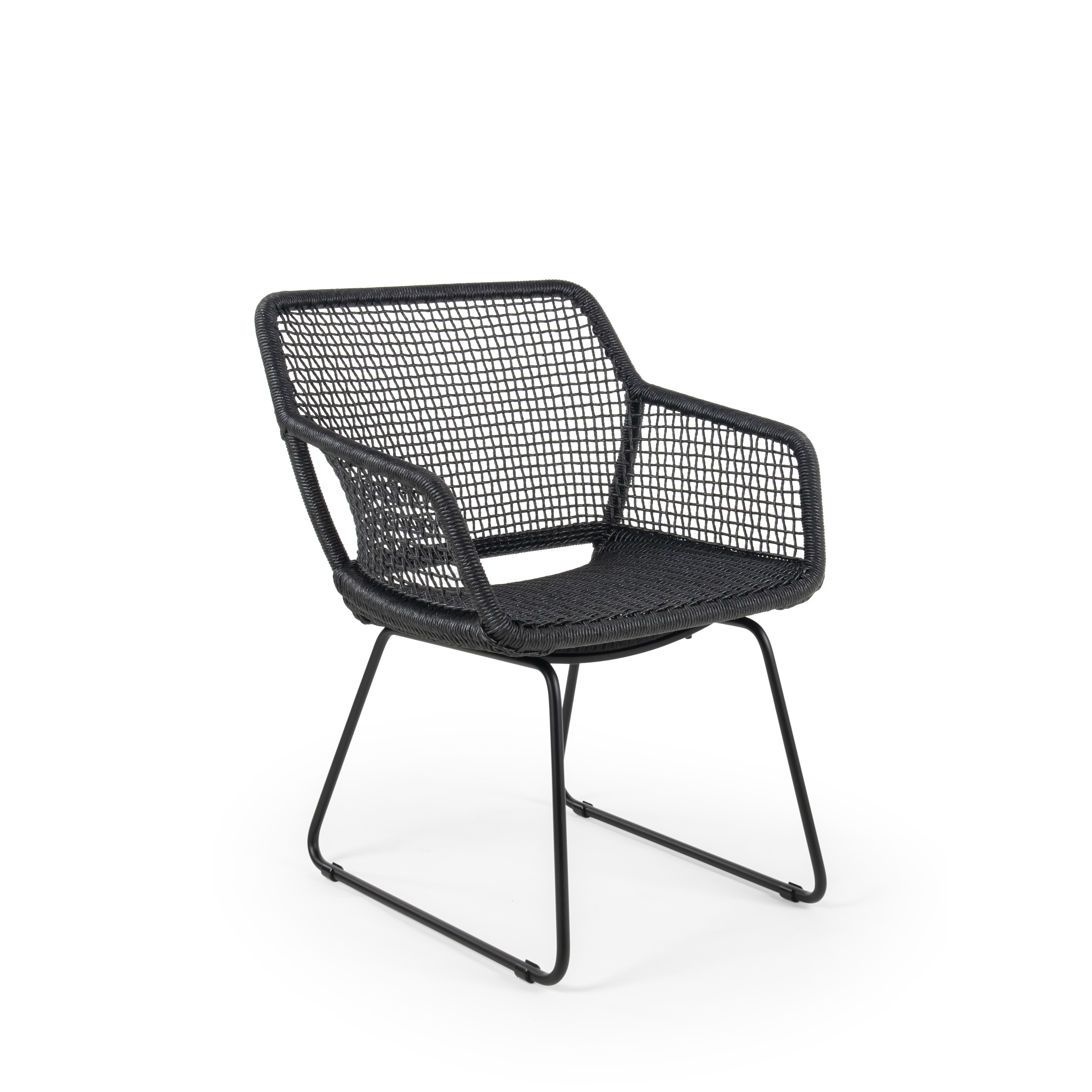 The Esta low dining chair, available in linen or black wicker, offers a modern design with a comfortable, low-profile seat. Its durable build and stylish look make it ideal for outdoor dining in any setting.