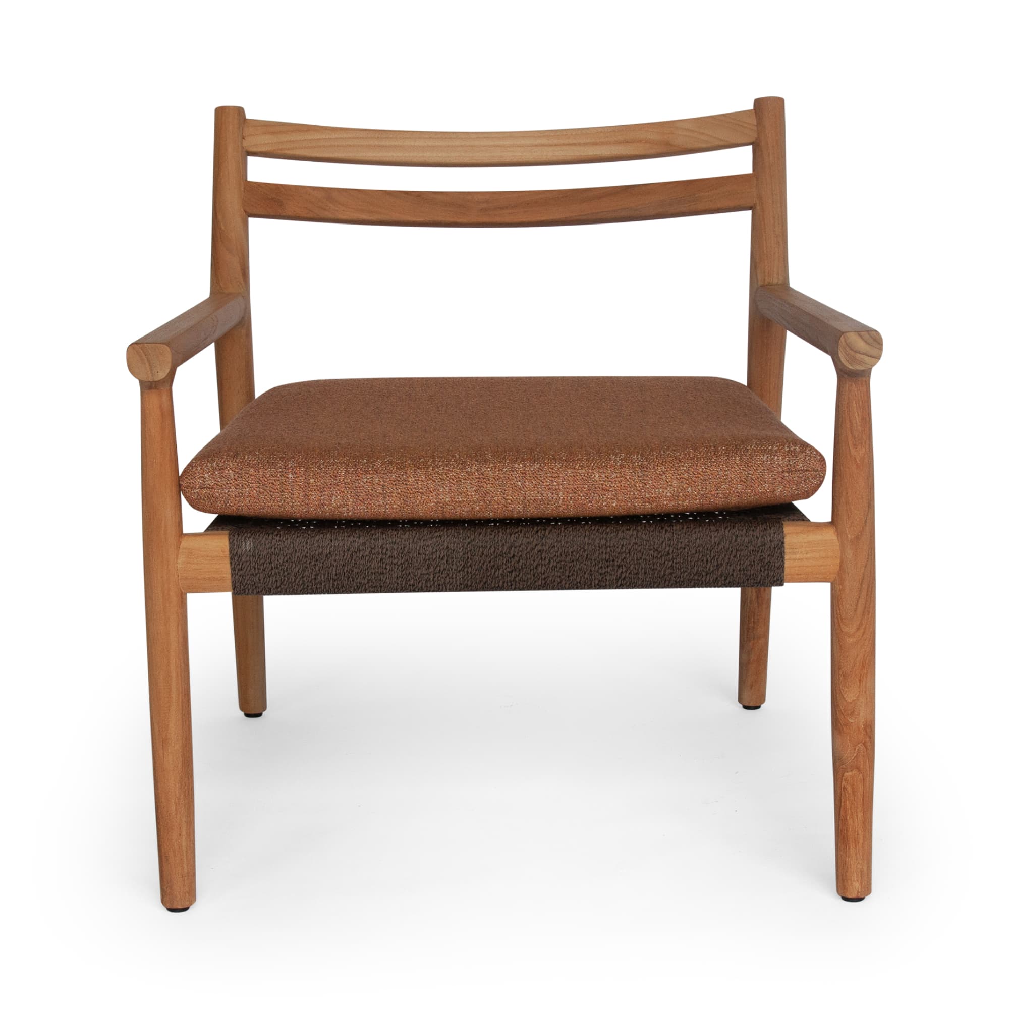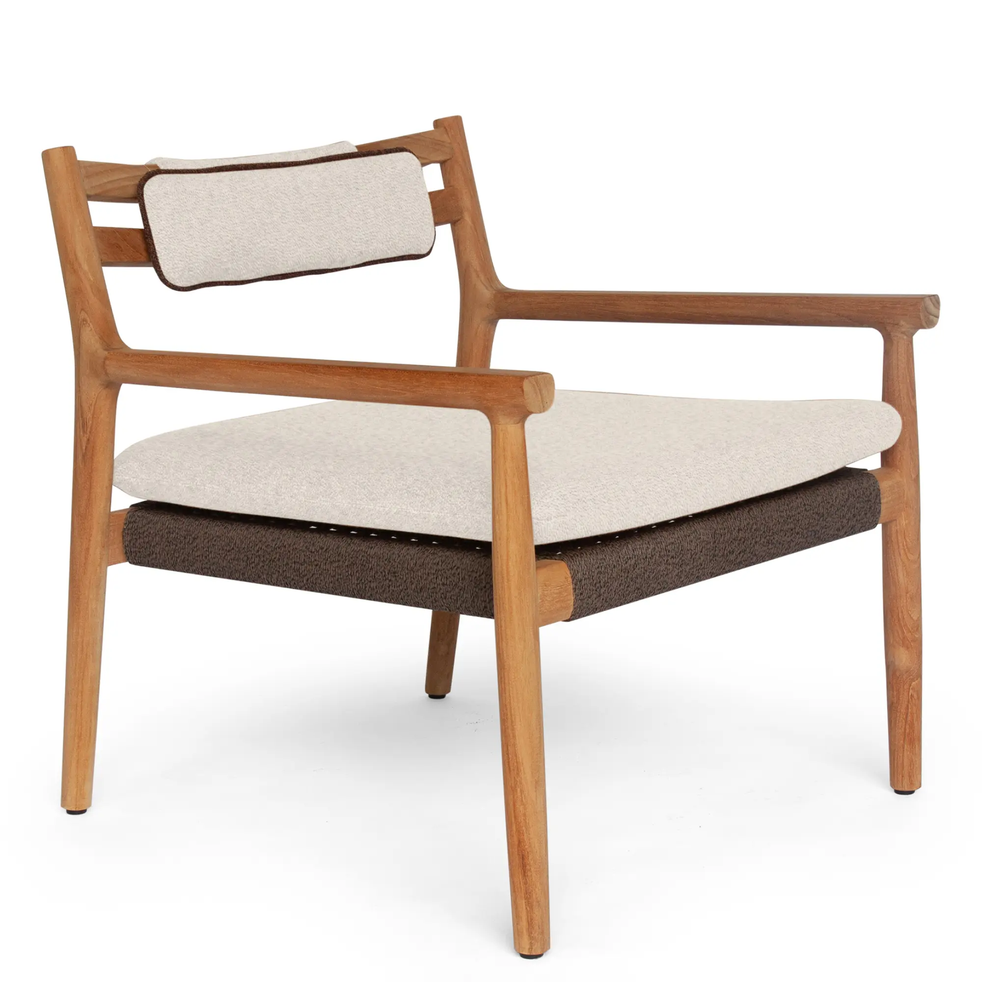 The Florence lounge chair combines a teak base with dark rope seating, offering both style and comfort. Its clean design and warm materials create a relaxed, summery vibe. Perfect for terraces, patios, or any outdoor lounging area.